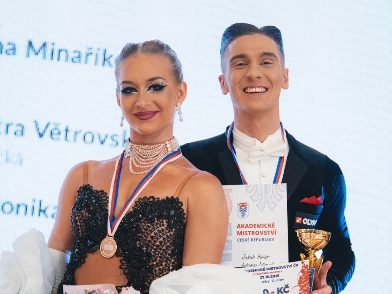 Dvě bronzová umístění na akademických mistrovstvích ČR vybojovali v uplynulých dnech studenti a studentky UP. Na šampionátu v tanečních sportech brala třetí místo ve standardních tancích dvojice Adriana Minarčíková a Jakub Huvar (oba FTK), v kategorii tanců latinskoamerických pak pár skončil pátý (další info zde). Bronzovou medaili si odnesla také Veronika Horková z FF, která předvedla třetí nejlepší výkon v kuželkách na mistrovství v kuželkových sportech (více o soutěži zde).