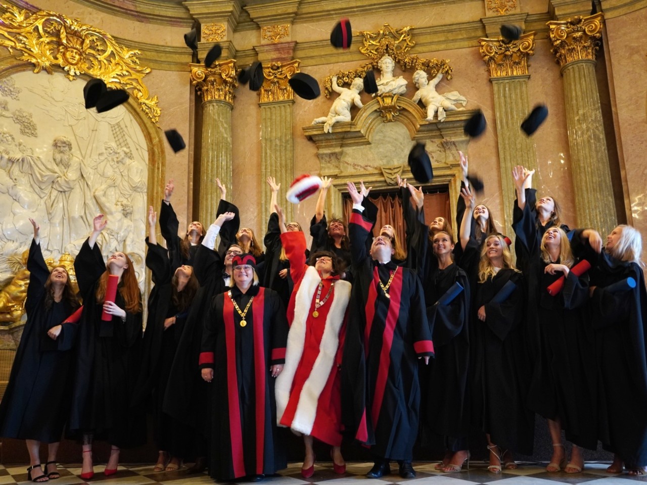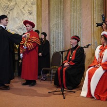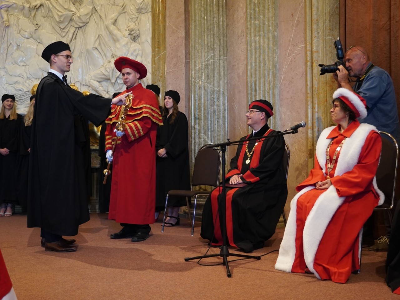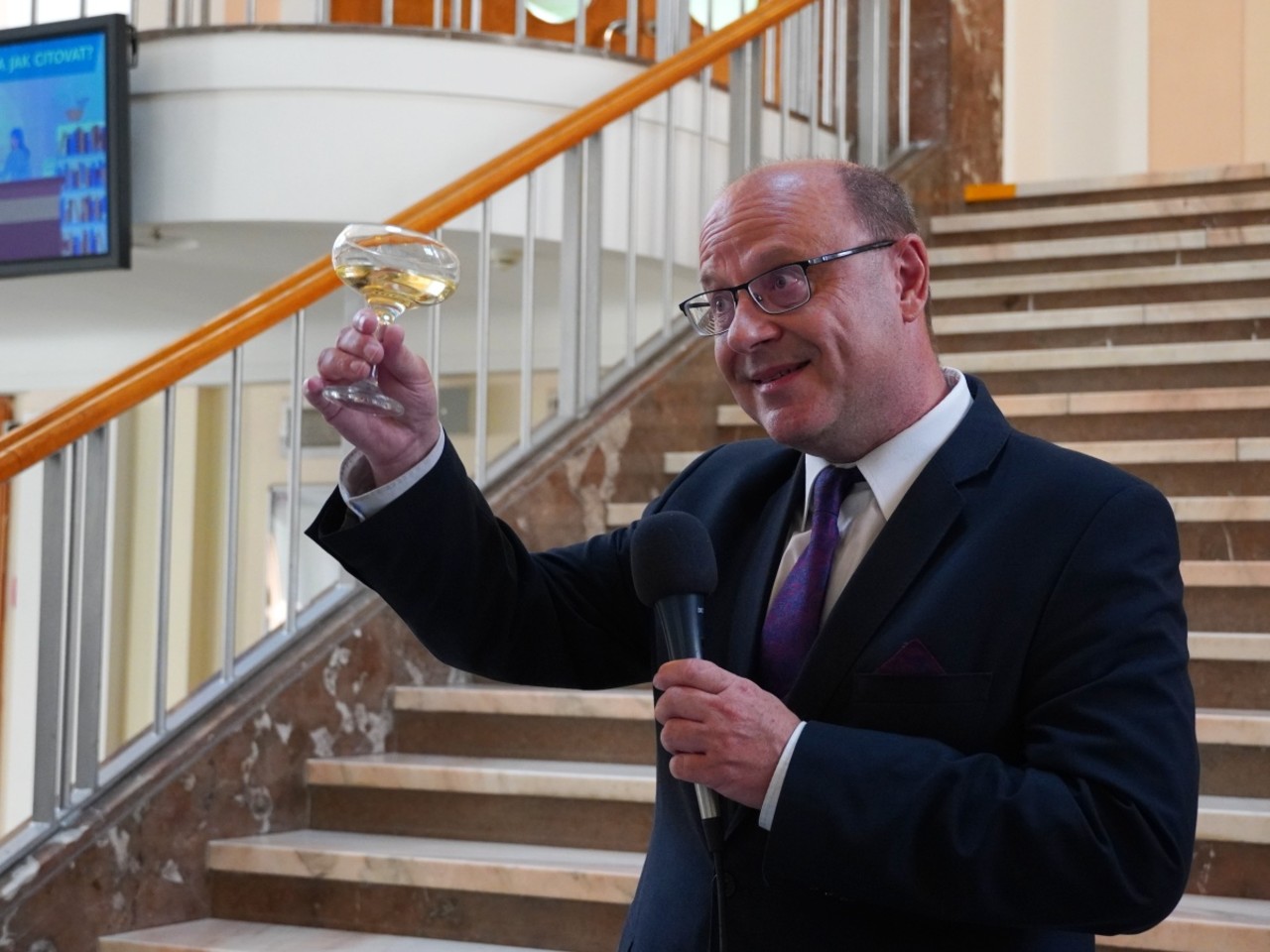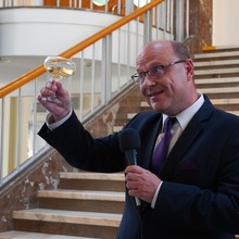 Oproti slavnostním aktům na Klášterním Hradisku se rozloučení s absolventy ve foyer Teoretických ústavů neslo v neformálním duchu, bez talárů, fanfár a hymen. I tady zazněla ale slova díků a přání. „Rád bych vám poděkoval za to, že jsme měli možnost se jako učitelé s vámi potkávat, učit vás a mít tu vzájemnou vazbu, pocit sounáležitosti. Zároveň bych vám chtěl z celého srdce popřát, ať se vám daří v osobním i profesním životě. Připíjím na vás všechny, jsme na vás hrdí a vždy budeme. Je jen škoda, že odcházíte,“ řekl při přípitku děkan Milan Kolář. Na úspěchy v životě „po škole“ si s absolventy „cinknuli“ také proděkanky Hana Kolářová a Eva Klásková a proděkan Dušan Klos.