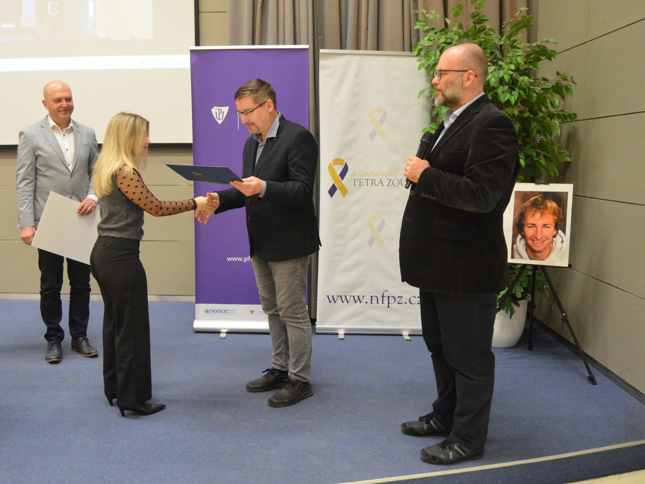 Cenu laureátkám předávali rodiče Petra Zoubka, děkan Václav Stehlík a proděkan Maxim Tomoszek. Foto: Eva Hrudníková