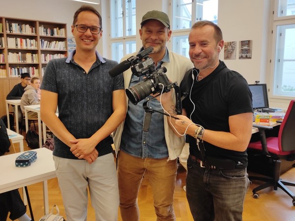 Frankofonní televize TV5 natáčela také na Univerzitě Palackého. Na snímku zleva Jan Zatloukal, ředitel Francouzského centra UP, Ivan Kabacoff, režisér pořadu Destination Francophonie a Cédric Fouré, kameraman snímku.