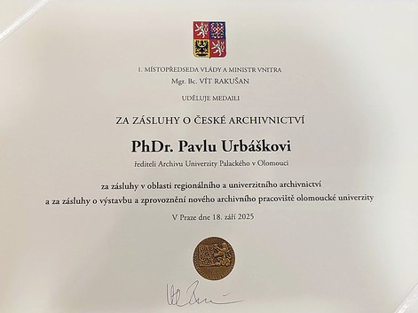 V budově Národního archivu převzal medaili Za zásluhy o české archivnictví Pavel Urbášek, vedoucí Archivu Univerzity Palackého. Prestižní ocenění, které se uděluje za celoživotní dílo či mimořádný čin pro české archivnictví, obdržel v rámci slavnostního ceremoniálu jménem ministra vnitra Víta Rakušana.