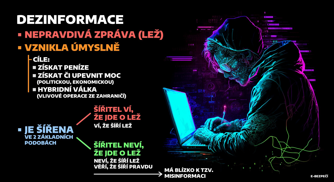 Autoři také upozorňují, že je třeba rozlišovat mezi dezinformací a misinformací. Jaké jsou mezi nimi rozdíly? Dezinformace jsou nepravdivé zprávy, které někdo ZÁMĚRNĚ vytvořil a rozšířil, aby dosáhl svého cíle – zpravidla cíle finančního (získat peníze od svých příznivců, zvýšit návštěvnost webu apod.) či politického (získat a udržet voliče), speciální druh dezinformací je pak součástí tzv. vlivových operací v rámci hybridní války (tam je cílem např. narušit demokracii, oslabit členství státu ve větších strukturách apod.). Dezinformátor VÍ, že šíří lež, a dělá to záměrně. Samozřejmě dezinformaci může v dobré víře šířit nevědomky i kdokoli z nás – tím se ale blížíme k dalšími termínu, misinformace.
