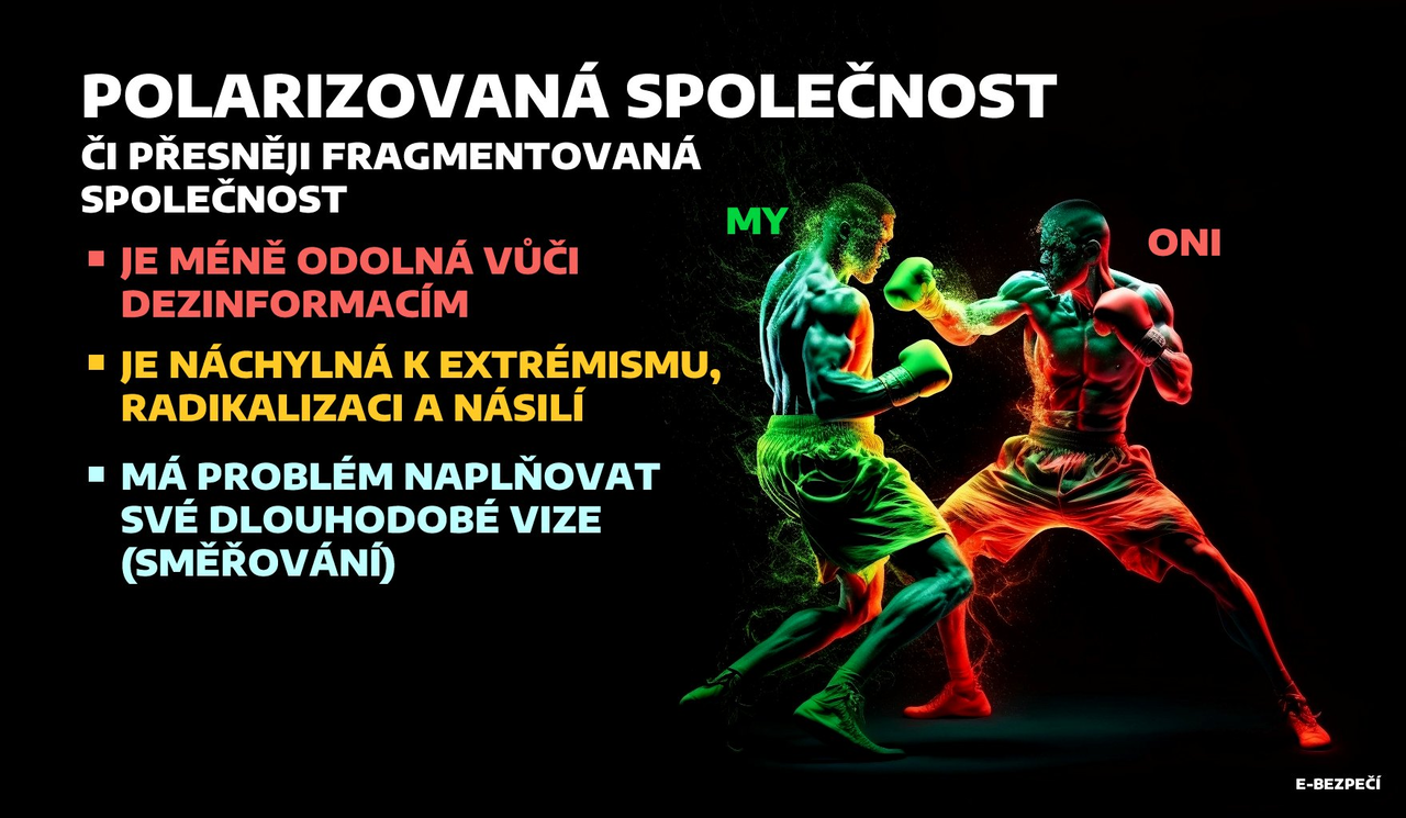 K velmi častým informačním poruchám (kognitivním zkreslením) patří tzv. polarizace, neboli černobílé vidění světa či černobílá perspektiva (my vs. oni).K polarizaci může docházet mimoděk a nevědomky, ale také cíleně - velmi často je totiž využívána v rámci politických kampaní k rozštěpení společnosti na dva opačné protipóly, přestože ve skutečnosti tyto protipóly proti sobě nestojí (či původně nestály). Polarizace je také častým nástrojem dezinformačních kampaní.