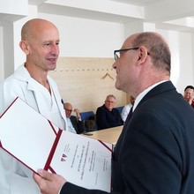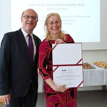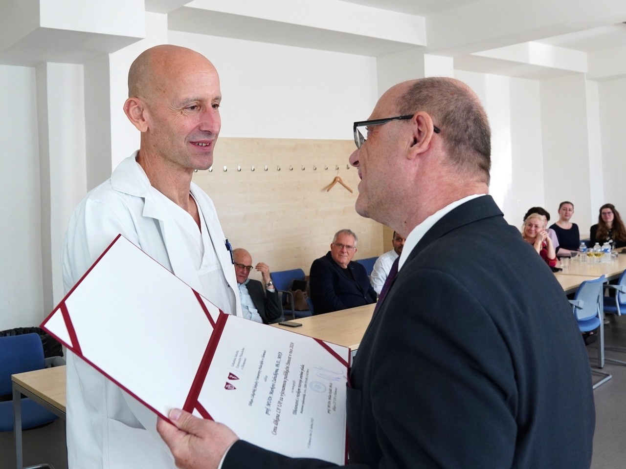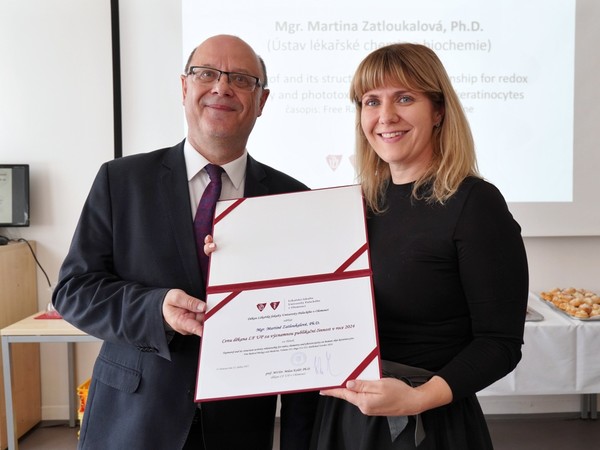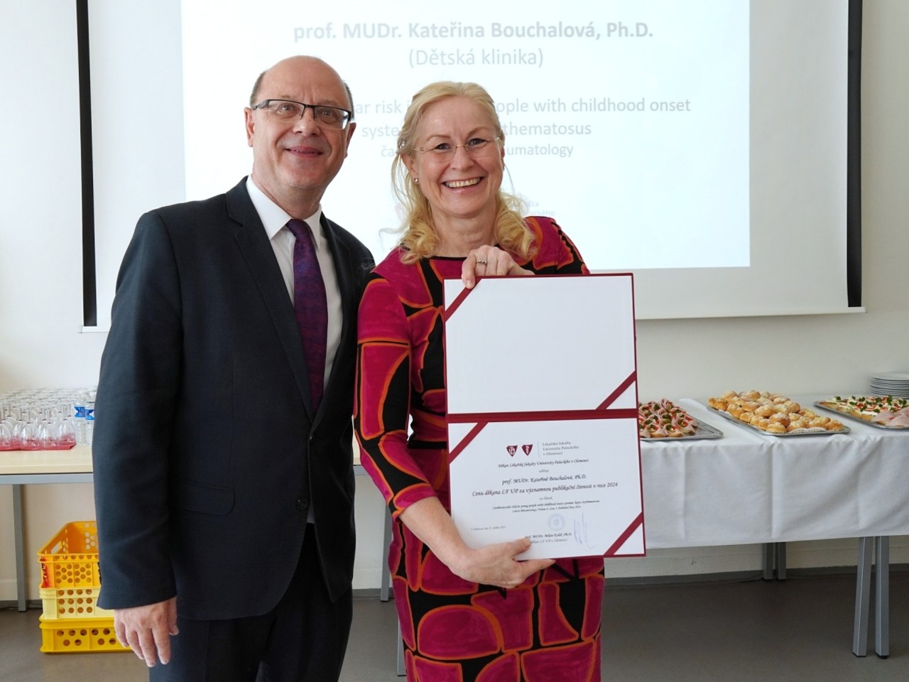 Cenu za původní nebo přehledovou práci publikovanou v prvním decilu obdržela mezi 26 autory například Kateřina Bouchalová z Dětské kliniky, jejíž portrét jsme před nedávnem přinesli zde, Martina Zatloukalová z Ústavu lékařské chemie a biochemie, Martin Mistrík z Ústavu molekulární a translační medicíny nebo Marek Ľubušký z Porodnicko-gynekologické kliniky, kterému děkan gratuloval hned dvakrát – ještě za monografii Těhotenství s rizikem rozvoje anémie plodu. Dalších 21 cen bylo uděleno v kategorii prací zveřejněných v prvním kvartilu, mezi nimi byl například přednosta Ústavu histologie a embryologie Zdeněk Tauber za studii v časopise Frontiers in Immunology, o níž jsme psali v tomto článku.