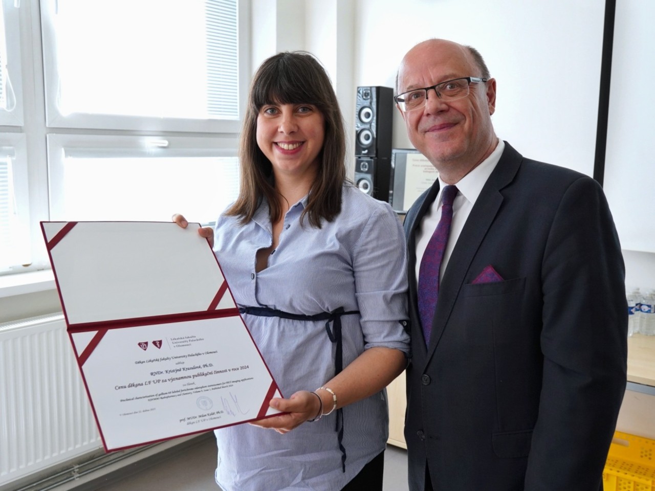 „Chtěl bych vám poděkovat za vaši skvělou práci a za všechno, co přinášíte ve prospěch naší fakulty. Velice si toho vážím a přeji, ať se vám daří i nadále,“ uvedl děkan. Upozornil zároveň na to, že na fakultě v posledních letech stoupá podíl vědeckých prací zveřejněných v prvním decilu a prvním a druhém kvartilu, tedy v těch nejlepších odborných časopisech v jednotlivých oborových kategoriích podle Web of Science, aktuálně činí již 77 % publikací LF UP v impaktovaných časopisech. „To mě a věřím, že i vás, velmi těší. Myslím, že je to známka zdravého vývoje fakulty z pohledu vědecko-výzkumného. A největší podíl na tom máte právě vy,“ dodal Milan Kolář směrem k laureátům.