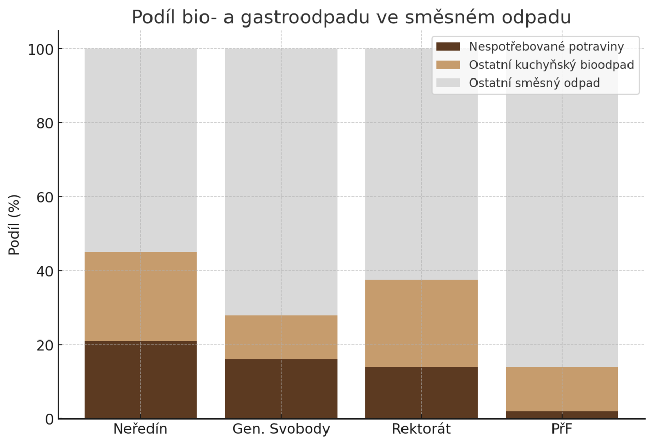 Největší podíl podle souhrnu výsledků představují kuchyňské bioodpady, které se v jednotlivých lokalitách pohybovaly mezi 28 a 45 procenty. Významným zjištěním je také vysoký výskyt nespotřebovaných potravin. Těch se například na Neředíně objevilo 21 %, na kolejích gen. Svobody 16 % a na rektorátu 14 %. Jen přírodovědecká fakulta vykázala výrazně nižší hodnotu, pouhá 2 %. Už v roce 2016 přitom díky studentskému spolku Udržitelný Palacký vznikla facebooková skupina „Free Food UPOL - sdílení jídla“, kde lze přebytečné potraviny nabídnout dalším zájemcům.