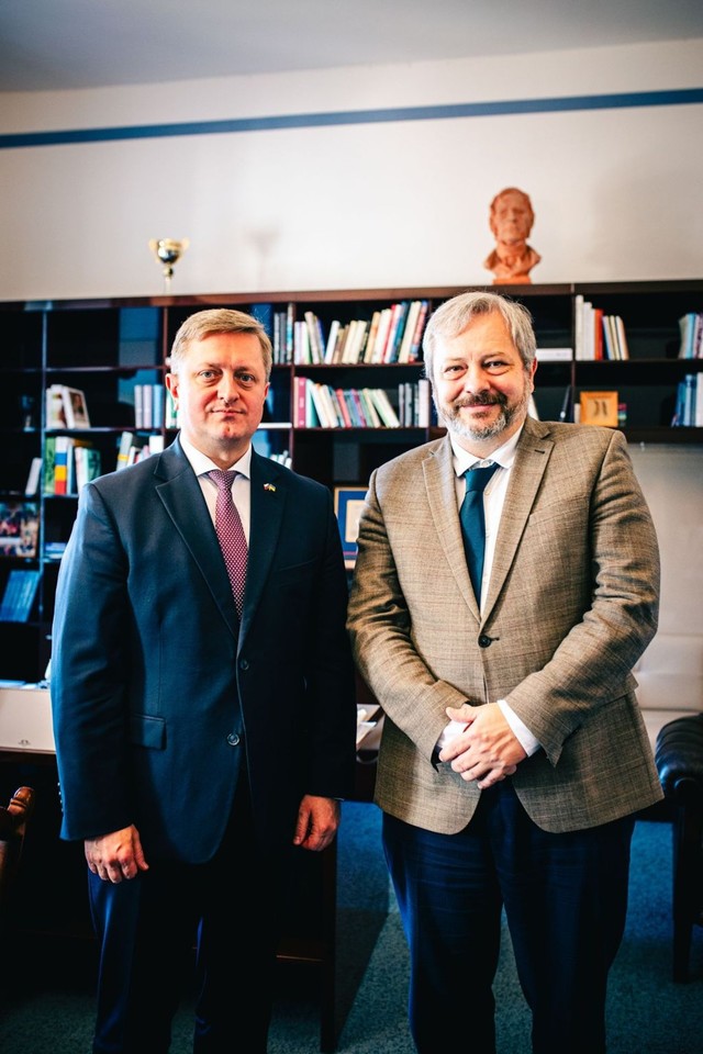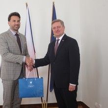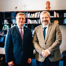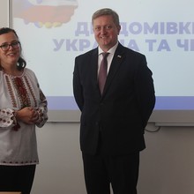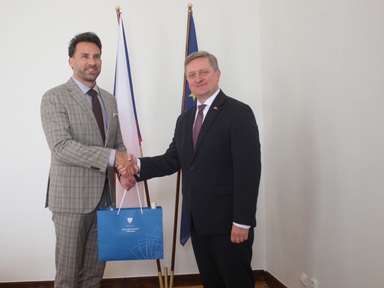 Ukrajinský velvyslanec Vasyl Zvaryč navštívil Univerzitu Palackého. Nejprve se potkal s rektorem Michaelem Kohajdou, poté hovořil s děkanem filozofické fakulty Janem Stejskalem. Debatoval i se studenty a studentkami ukrajinistiky.