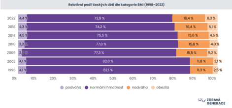 Více než pětina českých dospívajících má nadváhu nebo obezitu a jejich počet neustále roste. Ukazují to nejnovější data z mezinárodní studie HBSC (Health Behaviour in School-aged Children), kterou v České republice garantuje řešitelský tým z Univerzity Palackého. Studie navíc odhaluje silné propojení mezi vnímáním vlastního těla a duševním zdravím dětí.