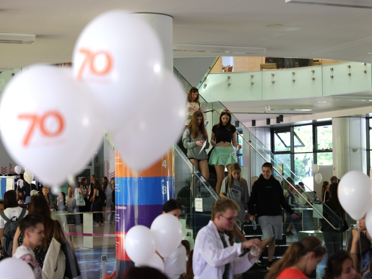 Přírodovědecká fakulta si v letošním roce připomíná 70. výročí od svého založení. Motto letošního Přírodovědného jarmarku proto znělo: Příroda slaví. Dokazovaly to i všudypřítomné nafukovací balónky s logem fakulty, které děti dostaly za splnění pěti úkolů od katedry analytické chemie.