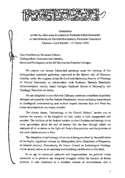 Účastníkům kolokvia zaslal pozdravný dopis Bartoloměj I., ekumenický pravoslavný patriarcha Konstantinopole. Ve svém listu připomněl, že „v době neustálých otřesů a narůstající fragmentace nás pohled církevních otců vyzývá k tomu, abychom naše časné boje vnímali v horizontu Božích zaslíbení. Vyzývá křesťany k neochvějnému svědectví smíření a vyzývá teologii, aby s odvahou a nadějí promlouvala k hlubokým úzkostem naší doby.“ S pozdravem se připojil také kardinál Kurt Koch, prefekt vatikánského Dikasteria pro podporu jednoty křesťanů, a Clemens Koja, ředitel vídeňské nadace Pro Oriente.