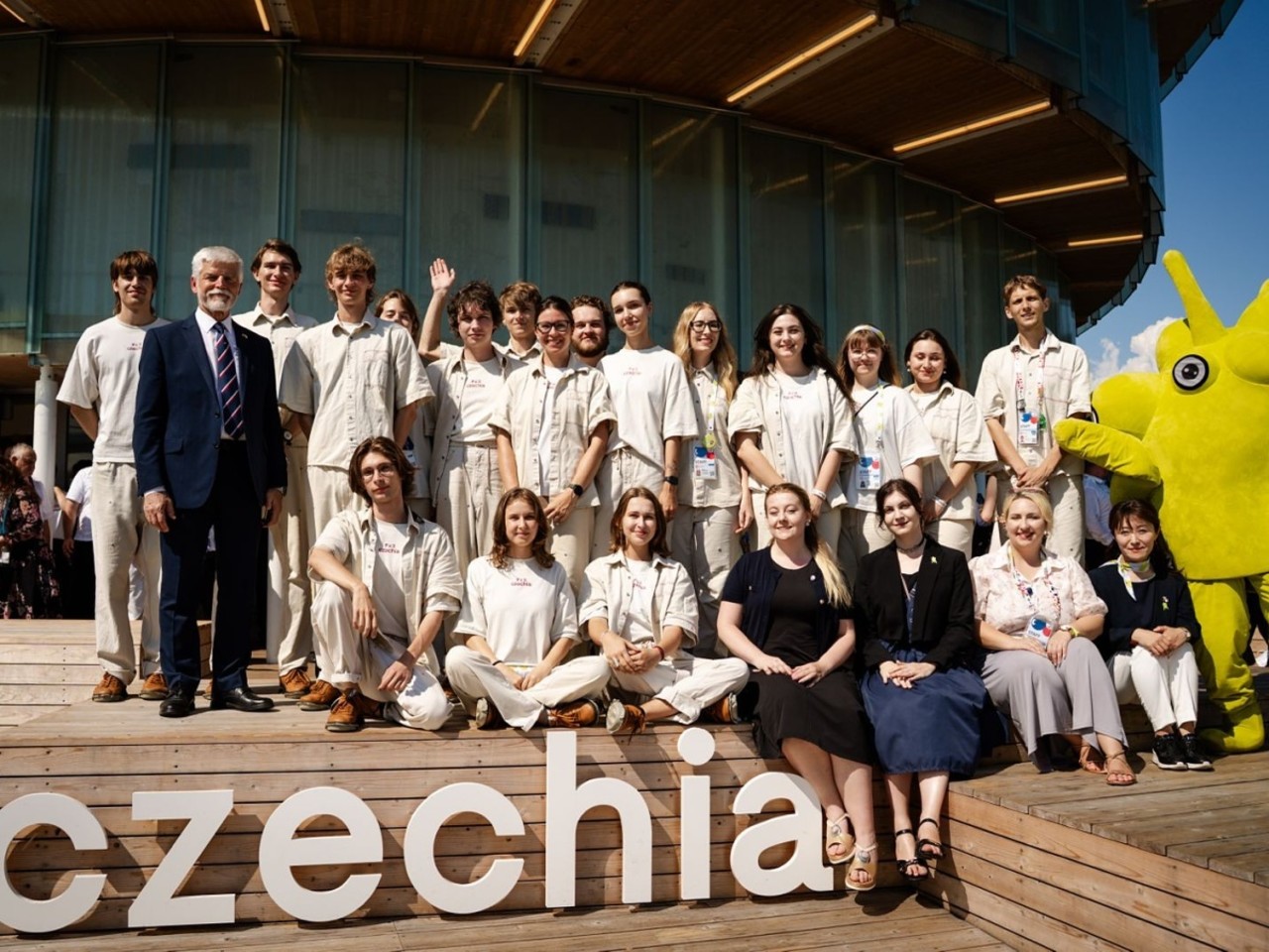 EXPO 2025, Český národní den a návštěva prezidenta ČR. Na snímku jsou společně s prezidentem lidé z kanceláře a téměř všichni attendati (poznávací znamení - khaki uniforma). Mnozí z nich jsou studenty UP. Petra Nepožitková, horní řada, pátá zprava. Fotogalerie: archiv (pn)