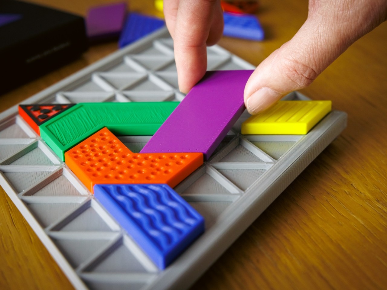 Novou didaktickou hmatovou hru, která pomůže nevidomým a slabozrakým dětem pochopit geometrické tvary a také proniknout do tajů abecedy, vytvořili odborníci z katedry experimentální fyziky Přírodovědecké fakulty Univerzity Palackého. Úkolem hráče je pomocí několika modulů ve tvaru rovinných geometrických obrazců sestavit velká písmena abecedy. Jedná se o třetí hmatovou hru, kterou odborníci z katedry experimentální fyziky zkonstruovali. Skládačka je vyráběna pomocí 3D tiskáren.