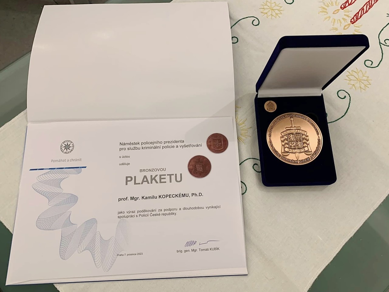Z rukou náměstka policejního prezidenta pro službu kriminální policie a vyšetřování (SKPV), brigádního generála Tomáše Kubíka, převzal bronzovou plaketu profesor Kamil Kopecký, vedoucí projektu E-Bezpečí Pedagogické fakulty UP. Ocenění obdržel jako výraz poděkování za podporu a dlouhodobou vynikající spolupráci s Policií ČR.