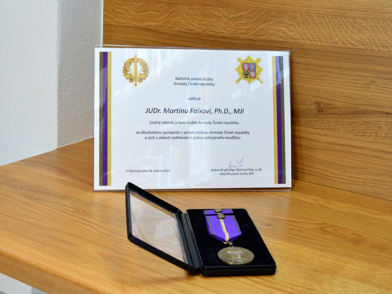 Martin Faix, vedoucí Centra pro mezinárodní humanitární a operační právo (CIHOL) při Právnické fakultě UP, převzal čestný odznak právní služby Armády ČR. Ocenění získal za dlouhodobou spolupráci a úsilí v oblasti vzdělávání v právu ozbrojeného konfliktu. Odznak s portrétem generála Bohuslava Ečera mu udělil plukovník Emil Hořčička, náčelník právní služby Armády ČR.