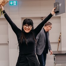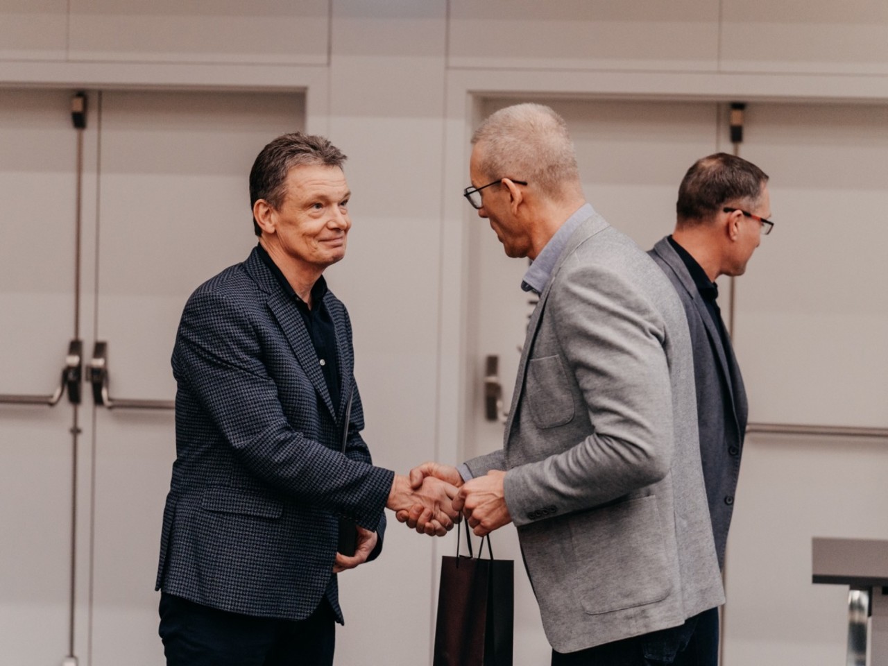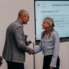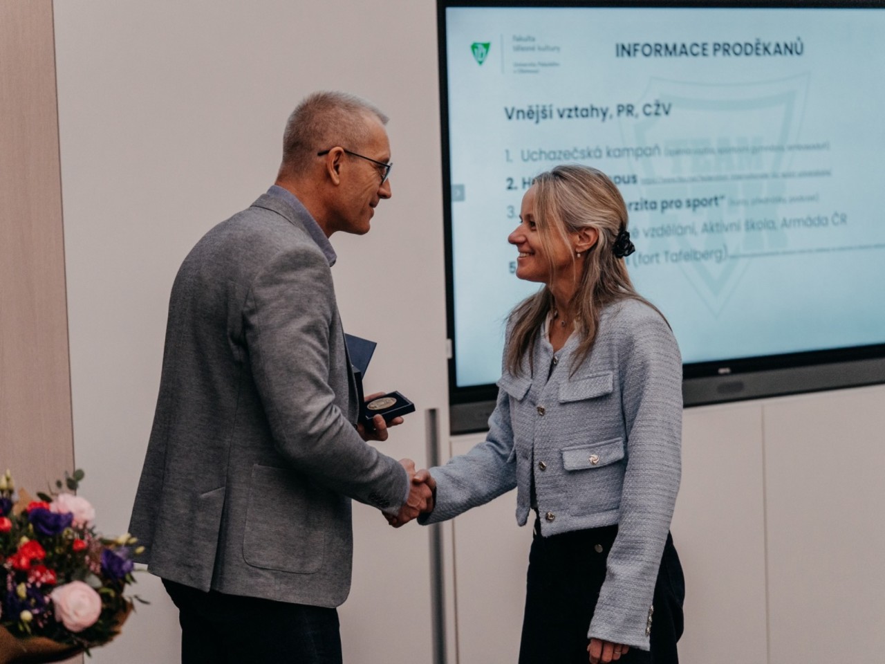 Ještě předtím ale Pavel Háp mimo jiné stihl předat první medaili, a sice bronzovou Za zásluhy o rozvoj UP, kterou převzala Jana Hoffmannová z katedry rekreologie, a také poděkovat za práci dlouholetému správci fakultních budov Miloslavu Konrádovi.