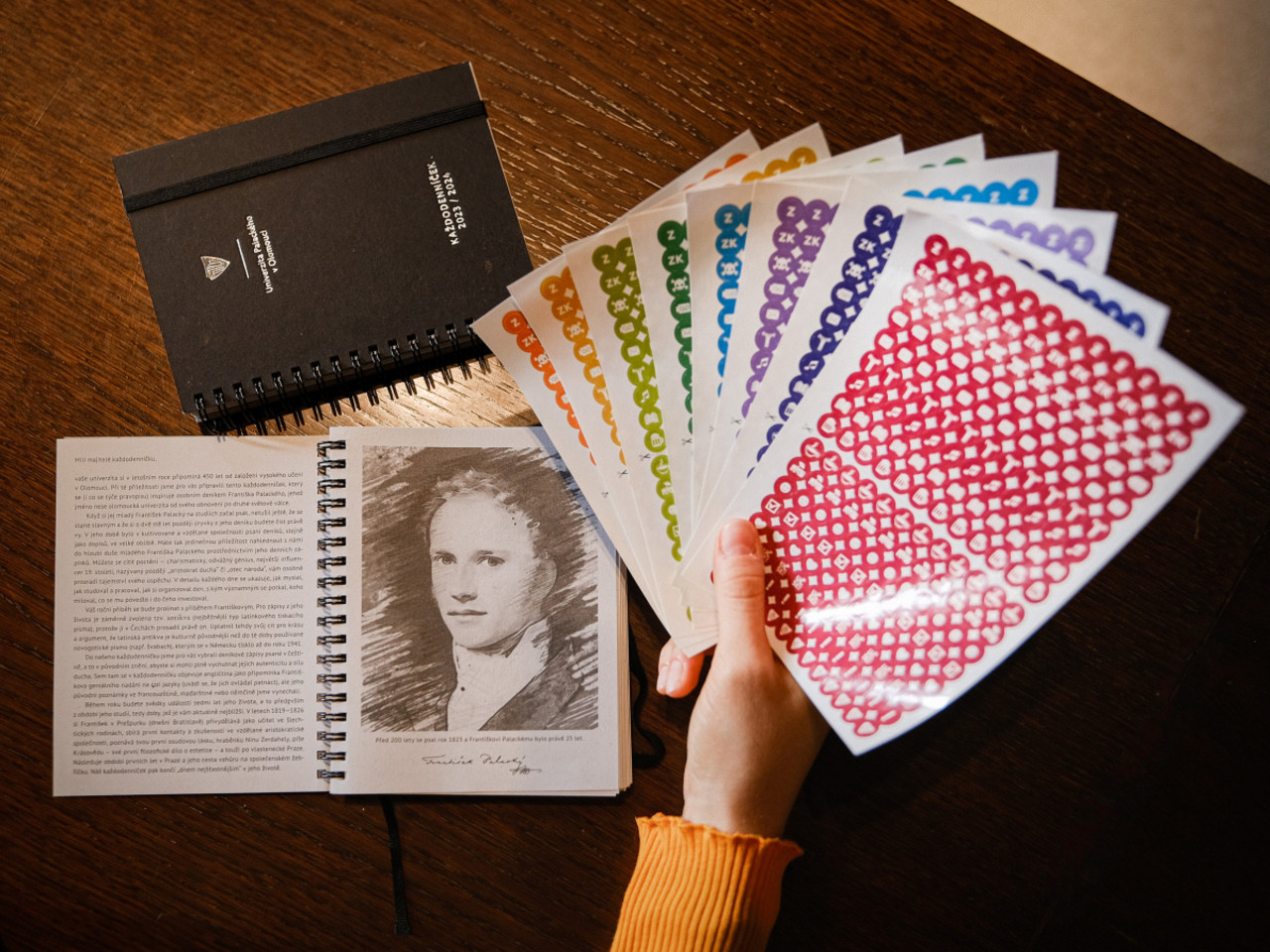 Majitele Každodenníčku pak možná bude František Palacký inspirovat natolik, že se po jeho vzoru odhodlají i k rozsáhlejším textům. Vhodným materiálem pro poznámky by v tomto případě mohla být další novinka na pultech UPointu: série historických bloků se šitou vazbou připomínající 450. výročí olomoucké univerzity. Na výběr je z pěti motivů obálek odkazující právě na dějiny UP: nejstarší českou mapu Měsíce, hvězdný glóbus, slavnostní vjezd kardinála Troyera do Olomouce, znázornění lomu světla či rektorské žezlo z poloviny 20. století. Bloky, které doplňuje i nová řada psacích potřeb v barvách fakult, vznikly ve spolupráci s Vydavatelstvím UP.