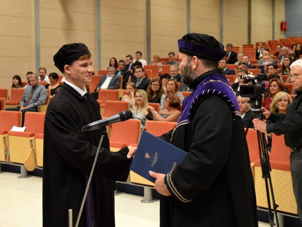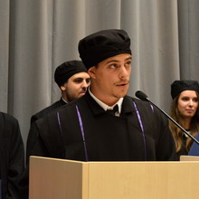 Absolvent magisterského studijního programu Pavel Glos se ve své děkovné řeči ohlédl za roky strávenými na univerzitě. „Naše fakulta nám nabídla obrovské množství příležitostí, jak se rozvíjet nejen pro stránce profesní, ale i po té lidské. Studentská právní poradna a další předměty zaměřené na praxi nám pomohly ukázat, že právo není jen o paragrafech, ale i o lidskosti a mezilidské komunikaci,“ řekl Pavel Glos a poděkoval za bezmeznou podporu rodinným příslušníkům, přátelům a akademickým pracovníkům. Svým kolegům popřál hodně zdraví, a aby je práce bavila. „Věřím, že budete skvělými právníky, kteří budou šířit dobré jméno Právnické fakulty Univerzity Palackého v Olomouci.“
