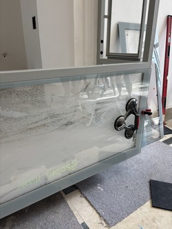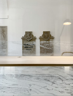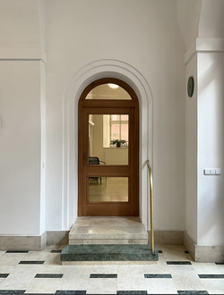 Nové boční dveře vychází z designu okolních dveří z 90. let, madlo je doplněno dle designu mosazných hlavních madel a schody jsou recyklací z pultu bývalé vrátnice.