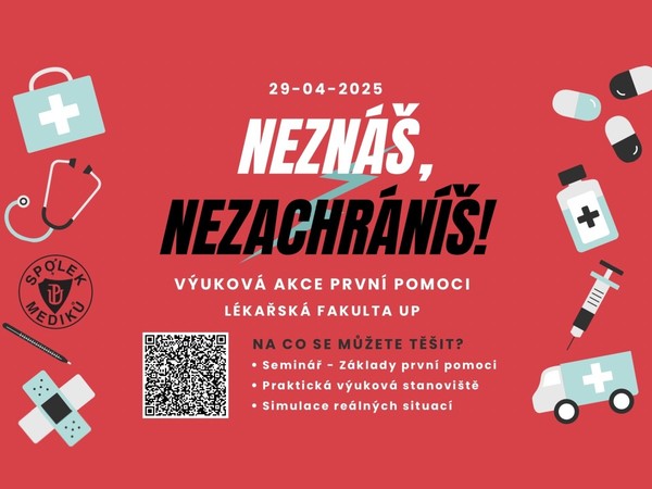 Studujete nelékařský program a chtěli byste si zopakovat a procvičit základy první pomoci? Ideální příležitostí je výuková akce Neznáš, nezachráníš, kterou pořádá Spolek mediků LF UP v úterý 29. dubna od 15 hodin. Na úvodní seminář navazují praktické nácviky na připravených stanovištích, zaměřených například na kardiopulmonální resuscitace nebo obvazové techniky, a simulace reálných situací, do kterých se lze v běžném životě dostat – průběh jednoho z dřívějších ročníků jsme přiblížili v tomto článku. Kapacita akce je omezená, zájemci se mohou přihlašovat prostřednictvím formuláře zde