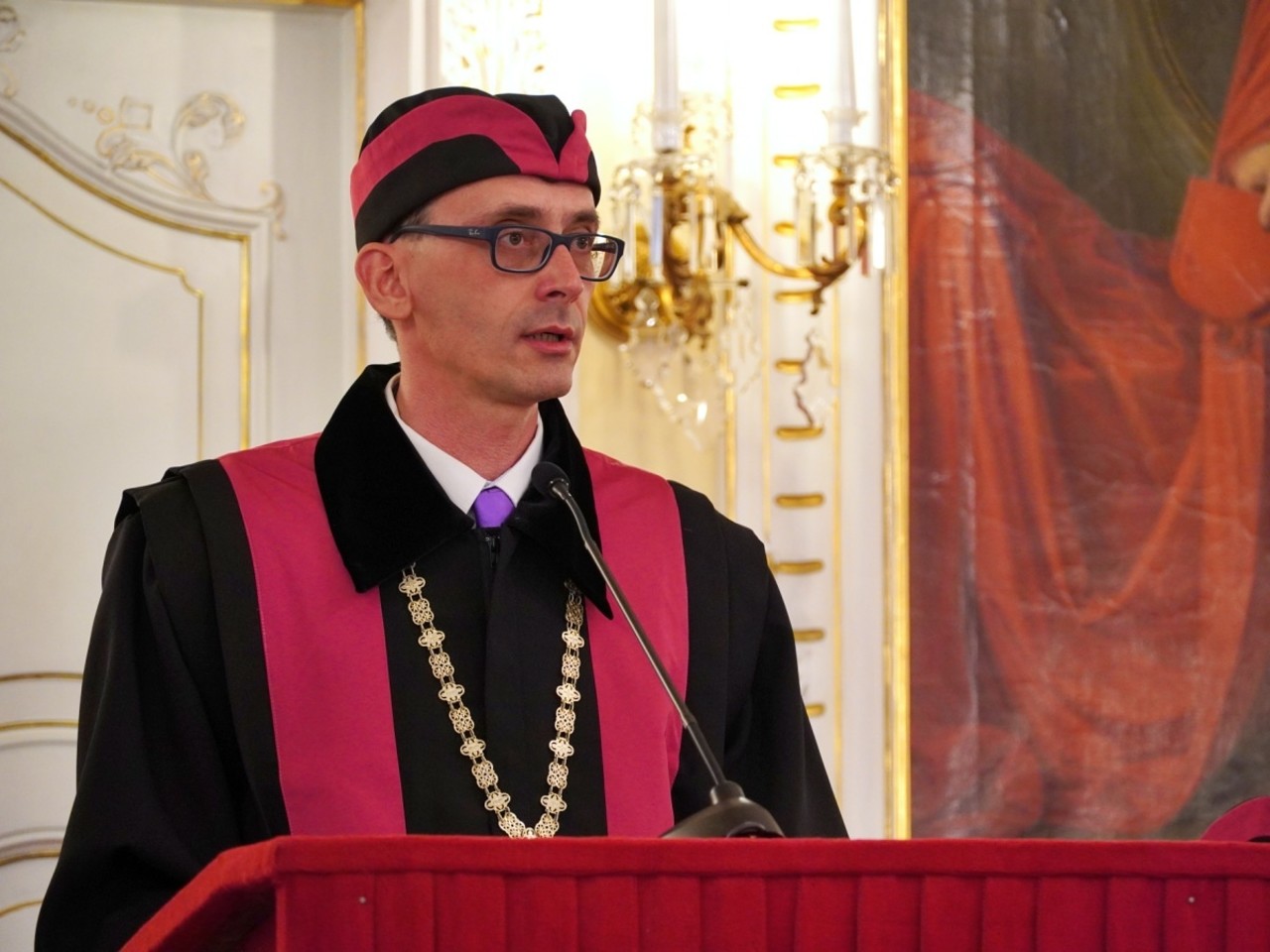 Za jednu ze dvou promujících skupin se ohlédnutí za studiem a poděkování ujal Jan Mlčoch, vedoucí katedry romanistiky na Ostravské univerzitě, který se k online výuce připojoval nejen z Ostravy, ale třeba i z kolumbijské Bogoty. „Naše motivace ke studiu byla různá. Někteří prožívali duchovní krizi a doufali, že jim studium teologie pomůže toto bolestné období překlenout. Další byli zvídaví a chtěli přijít na kloub záludnostem té nejsložitější, ale také nejvznešenější vědy. A jiní si řekli, že když už v době covidové čučet do obrazovek, tak ať to stojí za to a něco užitečného se dozvědí,“ shrnul v proslovu plném humorných odboček „ze zákulisí“.