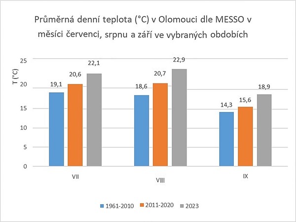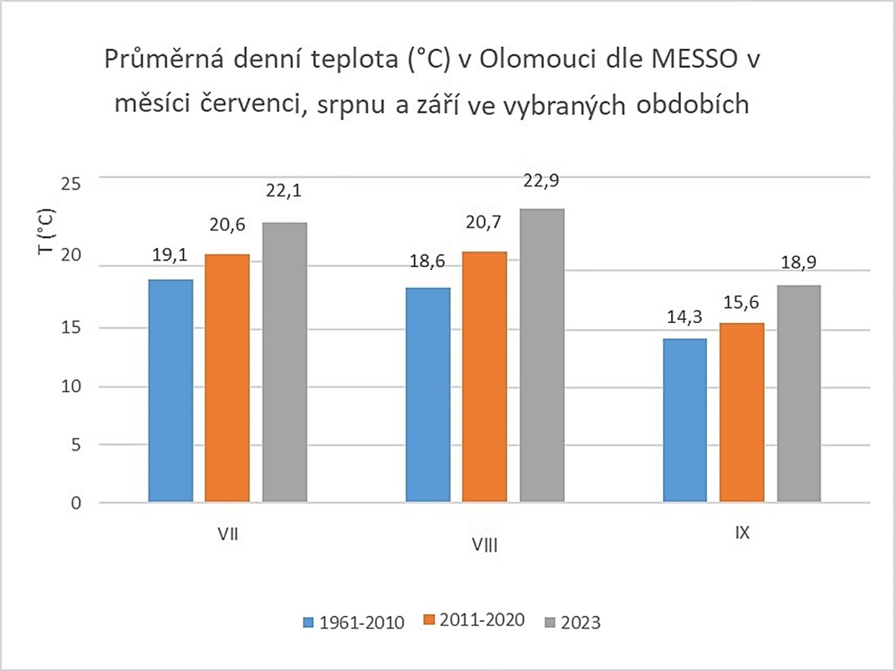 Po mimořádně horkém červenci a srpnu pokračovalo neobvykle teplé počasí i v září, kdy byly v Olomouci opět zaznamenány výrazně nadprůměrné teploty vzduchu. Nejvyšší teplota 31,1 °C byla v září v Olomouci naměřena dokonce dvakrát, a to 11. a 12. září 2023. Průměrná denní teplota v Olomouci za celé září činila 18,9 °C, což je o 4,6 °C více než činí dlouhodobý průměr pro tento měsíc. Vyplývá to z výsledků měření Metropolitní staniční sítě Olomouc MESSO, která od roku 2010 poskytuje základní meteorologická data pro město Olomouc a okolí.