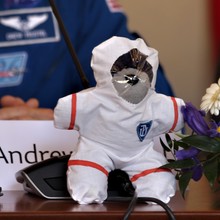 Na univerzitě se Andrew Feustel podepsal i do pamětní knihy. Kromě medaile si z Olomouce odveze astronaut i malého kolegu – speciálně vyrobeného medvídka UP ve skafandru, kterého mu věnoval rektor.