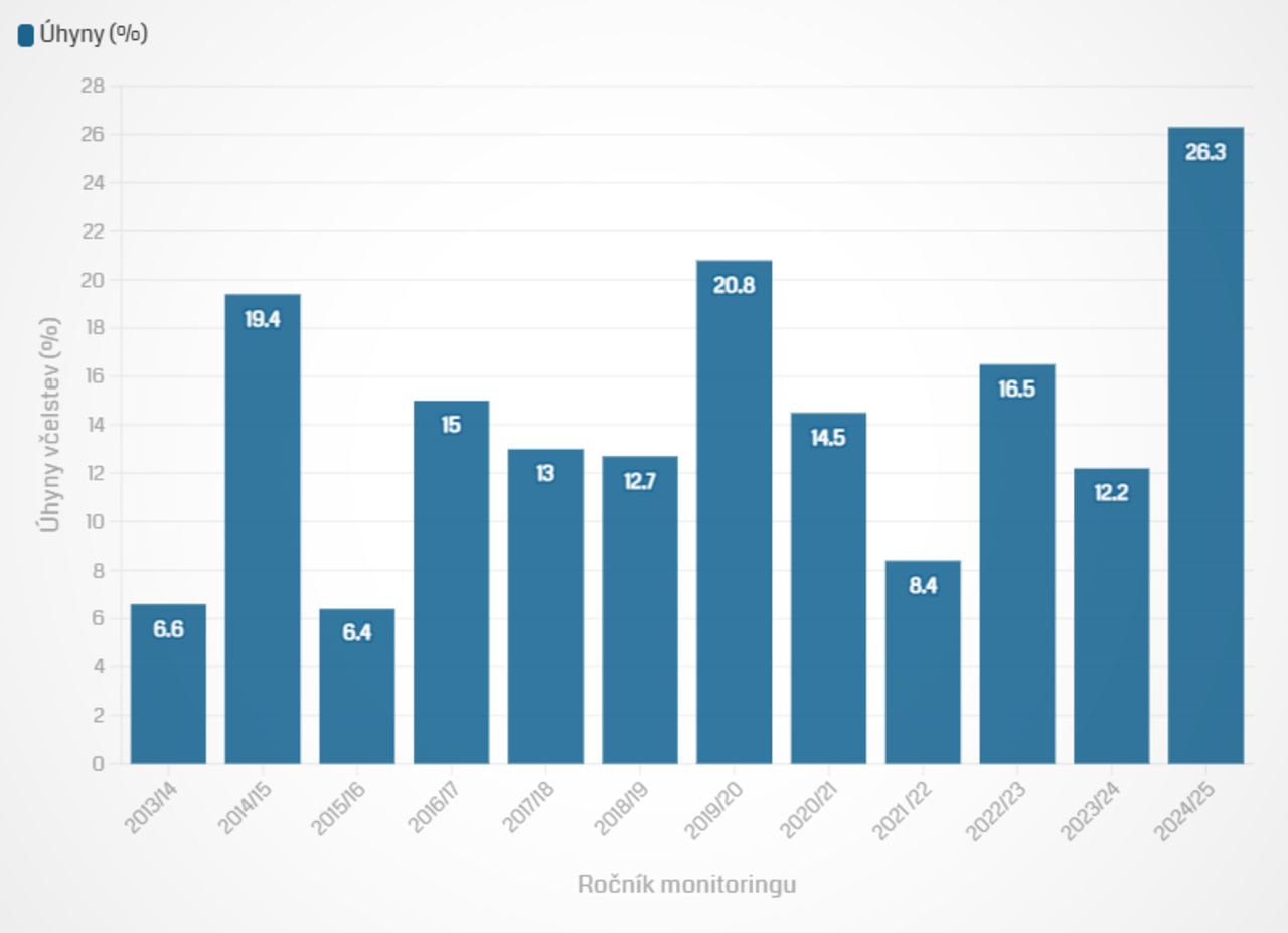 Předchozí zima 2023/2024 byla pro tuzemské včelaře mnohem přívětivější, zaznamenán byl úhyn 12,2 procenta včel. Přestože se období větších a menších úhynů pravidelně střídají, letošní údaje se tomuto dlouhodobému trendu podle Jiřího Danihlíka vymykají. Tuzemské chovy včel v zimě decimovala opět hlavně varroóza, která kvůli extrémně teplému jaru nabrala na intenzitě přibližně o tři týdny dříve než v předchozích letech. Teplé jarní počasí roku 2024 totiž umožnilo tomuto obávanému roztoči a přidruženým virózám dřívější rozvoj, což mělo za následek oslabení včelstev.