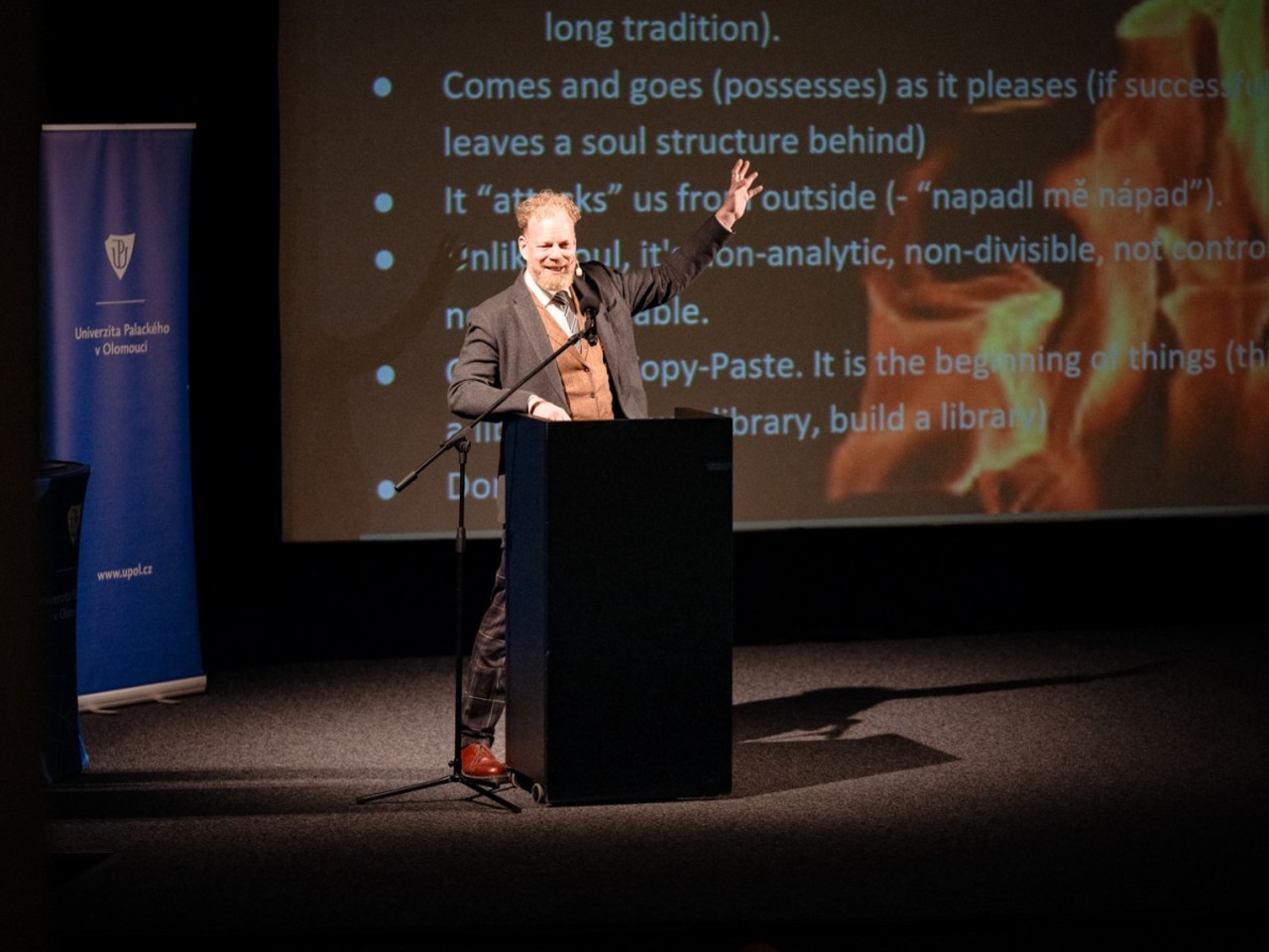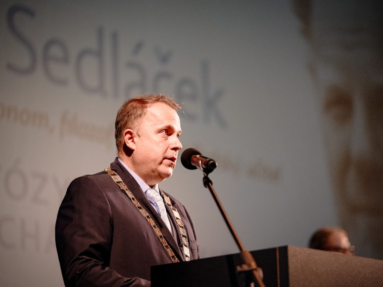 Hosta pak publiku představil Martin Mach, který působí na rektorátě a na Právnické fakultě UP a byl jedním z navrhovatelů letošního přednášejícího. „Tomáš Sedláček ve svých pracích často zdůrazňuje, že ekonomie není jen o číslech a grafech, ale také o lidských hodnotách a smyslu života. Věří, že budoucnost nejen ekonomie spočívá v růstu na duchu a poznání, nikoli v neustálém zvyšování materiální produkce. Tímto přístupem navazuje na myšlenky Josefa Ludvíka Fischera, který také hledal hlubší smysl a strukturu v lidském poznání a společnosti. Což je v plném souladu s tvrzením Tomáše Sedláčka, že ‚není totiž nic ekonomicky výhodnějšího než dobrá filozofie‘,“ zmínil Martin Mach.