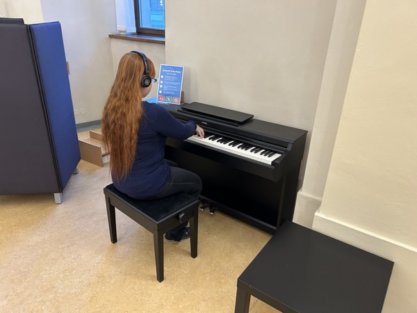 Knihovna UP prostě jede. Kromě knížek a různých dalších studijních materiálů, které jsou samozřejmostí, se snaží plnit i neknihovnická přání studentů. Třeba když si chtějí zahrát na piano. Divné? Rušivé? Vůbec ne. Stačí dobrá technologie. V časopisecké studovně ve Zbrojnici najdete nově digitální piano, půjčíte si sluchátka u výpůjčního pultu a hrajete (si).