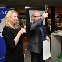 Výsledek spolupráce LF UP a VKOL představili a přípitkem pokřtili proděkan Milan Kolář a Petra Kubíčková z knihovny.