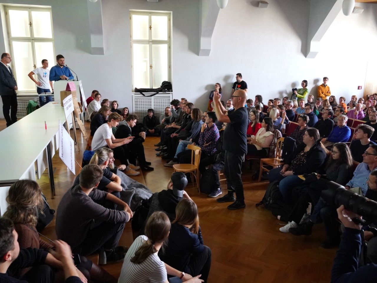 V zaplněné aule filozofické fakulty se debatovalo o návazných aktivitách, kterými chtějí zástupci humanitních a společenských oborů pod hlavičkou iniciativy Hodina pravdy stupňovat tlak na ministerstvo školství a vládu, ale také na vedení Univerzity Palackého.