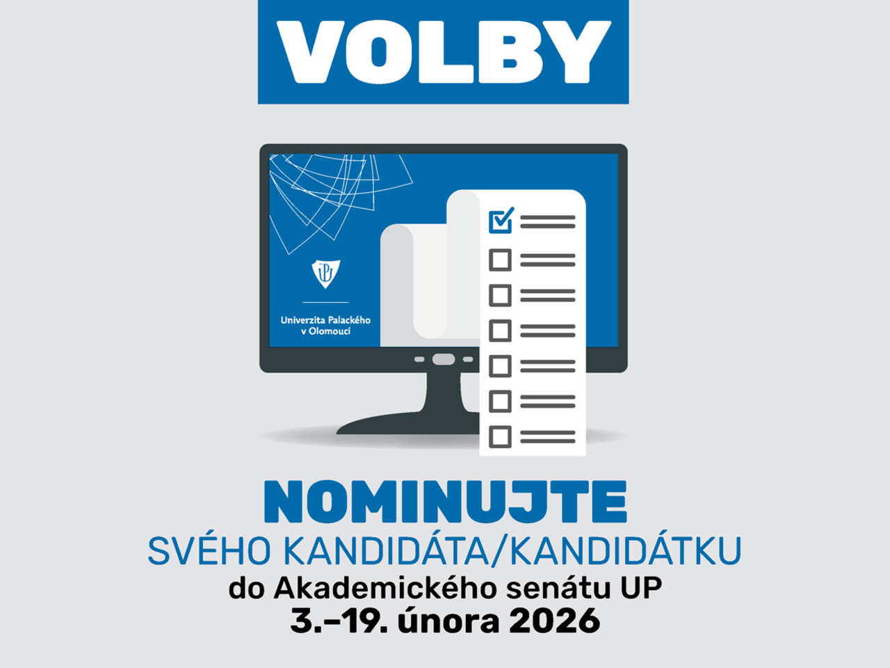 Po necelých třech letech bude akademická obec UP volit své univerzitní senátory a senátorky. Nominovat nové či staronové členy/ky Akademického senátu UP (AS UP) za některou z fakult mohou studující a akademici a akademičky od 3. do 19. února 2026. Samotné volby do klíčového samosprávného orgánu univerzity proběhnou online v polovině března. Veškeré další podrobnosti najdete na webu upol.cz/volby.