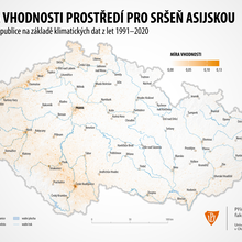 Invazí nebezpečné sršně asijské, která již pronikla na území Česka a nedávno byla poprvé odchycena a identifikována v okolí Plzně, je kvůli příhodným životním podmínkám ohrožena zejména západní část republiky. Zpozornět by měli odborníci a včelaři hlavně v okolí Českých Budějovic, Plzně a v Podkrušnohoří. Vyplývá to z unikátního počítačového modelu šíření tohoto predátora likvidujícího včelstva, který v letošním roce dokončili odborníci z přírodovědecké fakulty.