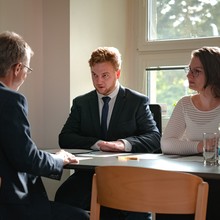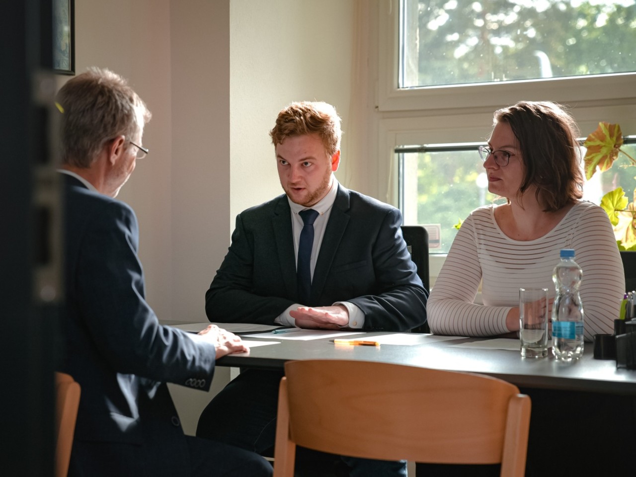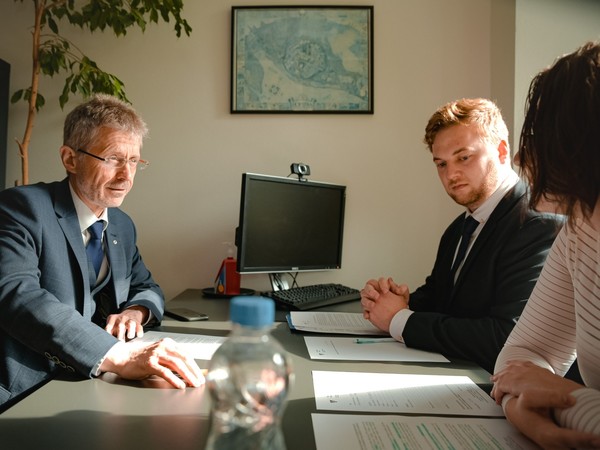 Hned ve dveřích přivítala Miloše Vystrčila dvojice studentů práv, Veronika Mašková a Daniel Skrbek. „Vítáme vás, prosím, prostudujte si pravidla naší poradny. Pokud s nimi budete souhlasit a dohodneme se na spolupráci, rádi si vyslechneme váš případ – problém, se kterým k nám přicházíte,“ řekli studenti a s Milošem Vystrčilem usedli ke společnému stolu. V rámci simulovaného vstupního pohovoru studenti zjistili, že si klient přišel pro právní radu, aby vyřešil sousedské spory.