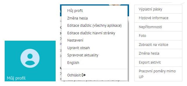 Na Portále UP je pro nahlašování dalších pracovních smluv speciální online formulář Pracovní poměry mimo UP. Najdete jej v sekci Můj profil (dlaždicí nebo rozkliknutím menu v pravém horním rohu):