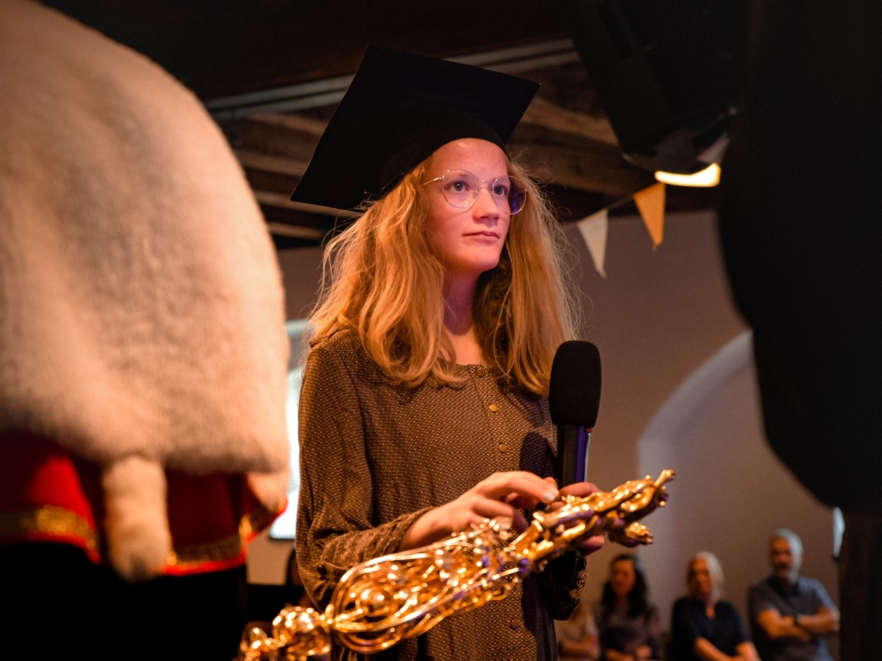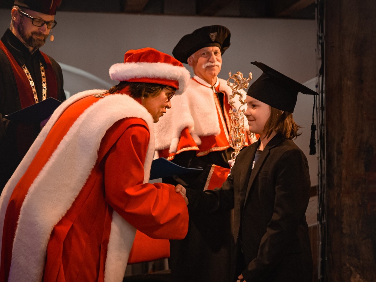 Odpoledne se konala výroční promoce Dětské univerzity, kde se sešli někdejší zakladatelé této popularizační akce a někteří absolventi. Mezi nimi i Edita Božková, která získala diplom v roce 2008 a svoji účast hodnotí velmi pozitivně. „Seznámila jsem se s mnoha vědními obory. Pamatuji se, že se to konalo v Moravském divadle a nejvíc si vybavuji workshop medicíny, kdy jsme se věnovali lidskému srdci. Už je to dávno,“ usmála se dívka, která šla studovat vojenskou školu a následně Univerzitu obrany.