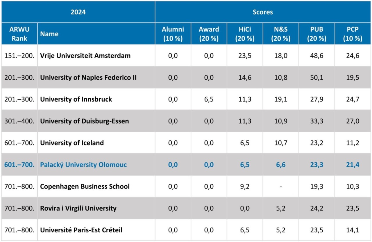 Pouze šest českých univerzit se dostalo do tisícovky nejlepších vysokých škol na světě podle letošního vydání prestižního hodnocení Academic Ranking of World Universities (ARWU), známého též jako Šanghajský žebříček. Již poosmé je mezi nimi i Univerzita Palackého, která v rámci Česka obsadila 3. místo a ve světovém srovnání je na 601.–700. příčce – stejně jako vloni a stejně jako například University of Iceland, která je společně s UP členem univerzitní sítě Aurora.