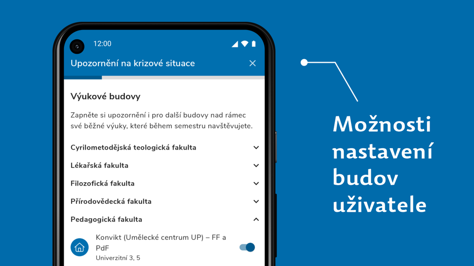 Krizový modul bude v UPlikaci zprovozněn 28. listopadu 2024. Všem jejím uživatelům se automaticky zobrazí průvodce, v němž upřesní místa a budovy, ve kterých se v průběhu semestru nachází. Studující a akademici mají budovy, ve kterých se podle svého rozvrhu v daném semestru vyskytují, rovnou přednastaveny podle STAGu. Doporučeno je však projít si v UPlikaci veškerá nabízená místa a doplnit výběr o další, ve kterých se v průběhu semestru pohybují – například knihovnu, menzu či koleje.