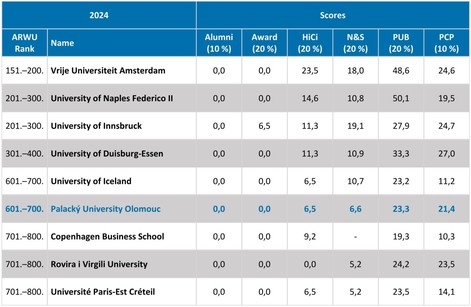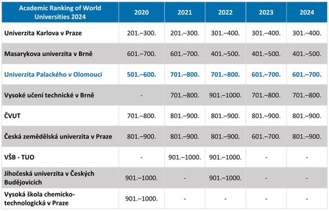 Pouze šest českých univerzit se dostalo do tisícovky nejlepších vysokých škol na světě podle letošního vydání prestižního hodnocení Academic Ranking of World Universities (ARWU), známého též jako Šanghajský žebříček. Již poosmé je mezi nimi i Univerzita Palackého, která v rámci Česka obsadila 3. místo a ve světovém srovnání je na 601.–700. příčce – stejně jako vloni a stejně jako například University of Iceland, která je společně s UP členem univerzitní sítě Aurora.