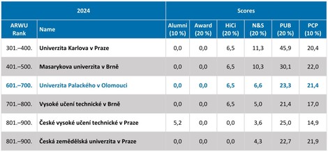 Dále se v TOP 1000 objevují Vysoké učení technické v Brně, České vysoké učení technické v Praze a Česká zemědělská univerzita v Praze, která si v žebříčku jako jediná z tuzemských škol pohoršila, kvůli letošní nule v indikátoru vysoce citovaných výzkumníků. Ostatní české vysoké školy včetně UP mají ve sledovaných indikátorech obdobné hodnoty jako v minulém roce.